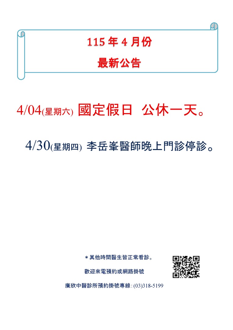 4/30(星期四) 李岳峯醫師晚上門診停診。